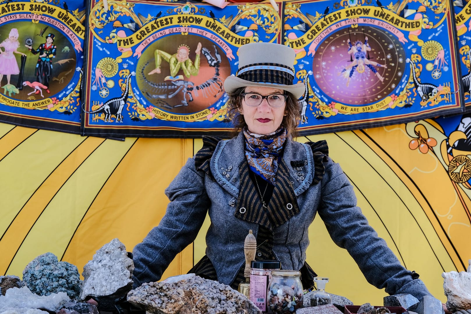 The Rock Showman’s Booth is a stunningly illustrated mobile venue designed to house our unique educational and entertainment activities. It’s exterior combines the aesthetic of historical Miners’ and Showmans’ banners that communicate strong messages of our custodianship of the planet. It’s interior walls feature a rich and colourful educational display to make an inspirational mobile classroom.